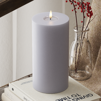 Тази елегантна LED блок светлина в Прашно синьо Предлага ефект на „истински пламък“ в реалния живот, който е толкова жизнен, колкото истинска свещ. С височина 20 см и диаметър 10 см, всяка светлина на LED блок е внимателно изработена от свещи и смола, оборудвана с жизнен 3D пламък и уникално покритие от смола в горната част. Тази конкретна комбинация не само създава автентично усещане, но също така придава отличителния „мокър вид“, който имитира перфектно разтопени свещи.