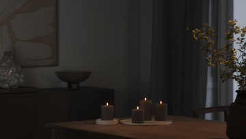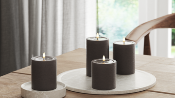 Brug bloklys i små grupper med forskellige højder. Det giver dybde og et gennemført udtryk i indretningen.